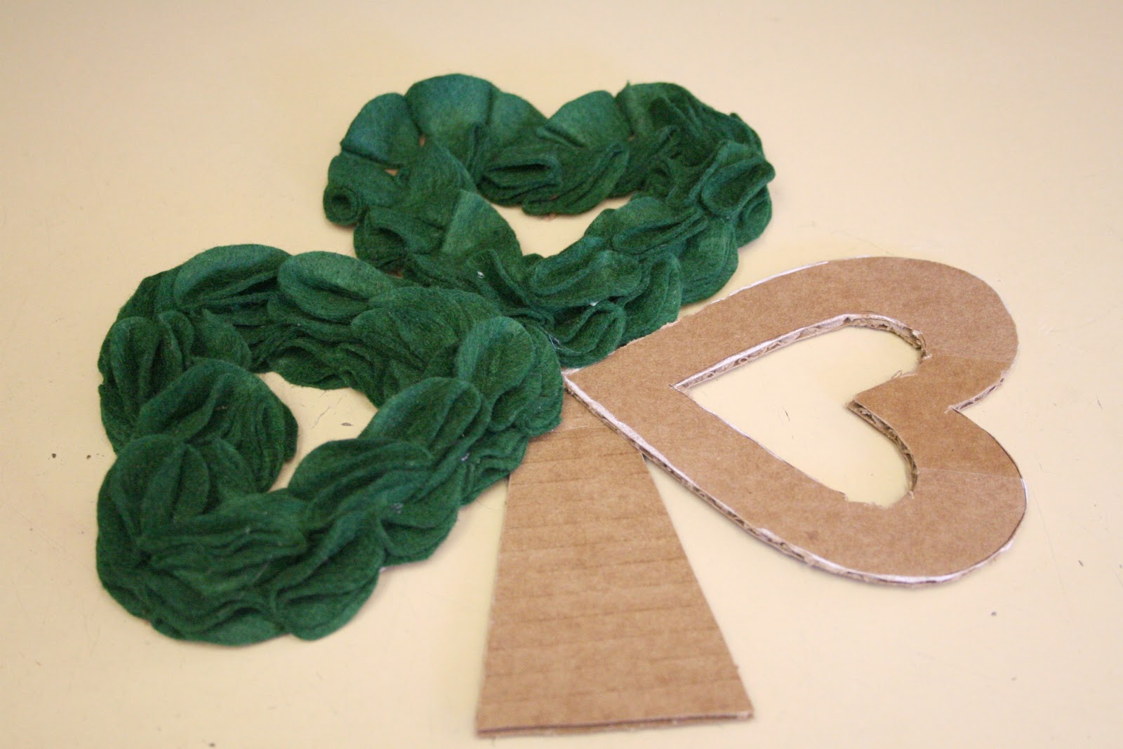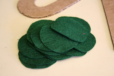 Okay…so I wasn’t originally going to make anything for St. Patty’s Day to hang on the front door, I was going to skip right to the spring wreath. Then while trying to decide on what I should have my spring wreath look like, I just decided to be frugal and throw something together that was {FREE} and would serve the purpose for the next month until I gather my thoughts and come up with a spring wreath I want to make. So I pulled out my trusty felt {FREE}, and some cardboard {FREE, luckily I got a package today while I was hunting all over the house for some cardboard to use…can you say perfect timing!} I saw this cute little number the other day and posted it on my post a couple days ago…