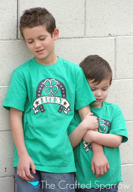 I found the graphic online and used my freezer paper to create a stencil. Although I did have to free-hand trace with a paintbrush around the banner, clover and letters. These shirts took way too long to make, but my boys look cute, and that’s all that matters.