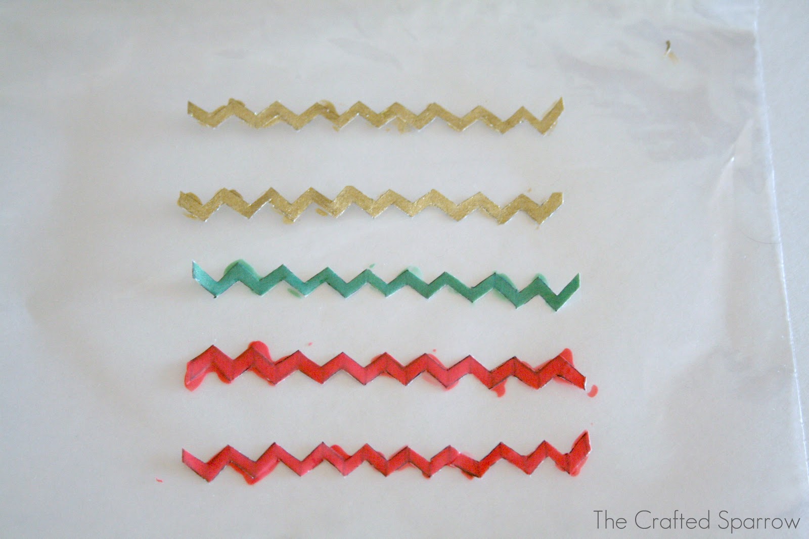Next you will stick the masking tape zig zag pieces on to a plastic zip-lock bag and paint with nail polish in your choice of color. Let the first coat dry before painting the second. You can do up to 3 coats depending on how the nail polish is covering the masking tape. I did 2 coats on mine.
