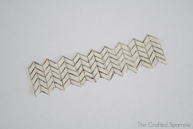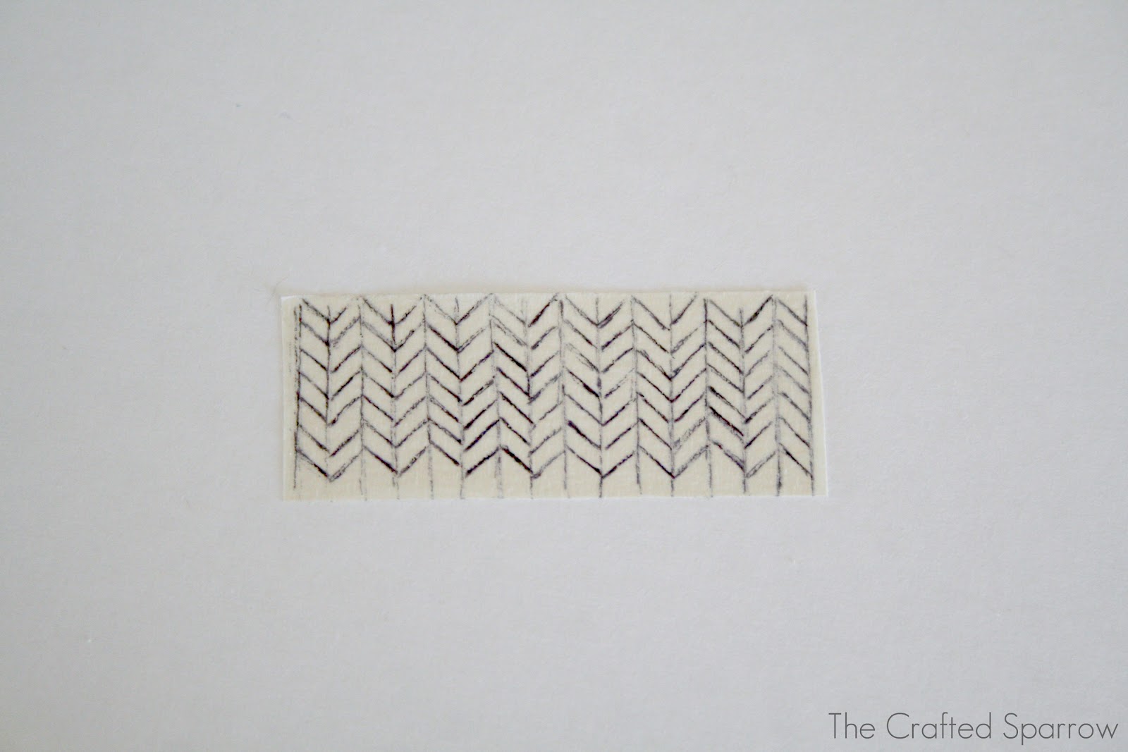 While the base color on my earrings was drying I got my masking tape and made my chevron stickers. I started by cutting a length of masking tape I knew would be long enough to fit the earring. Then I created my chevron pattern. For this photo I used a black marker to show you the design, but I recommend using a pencil lightly so that when it’s painted you don’t see the lines.