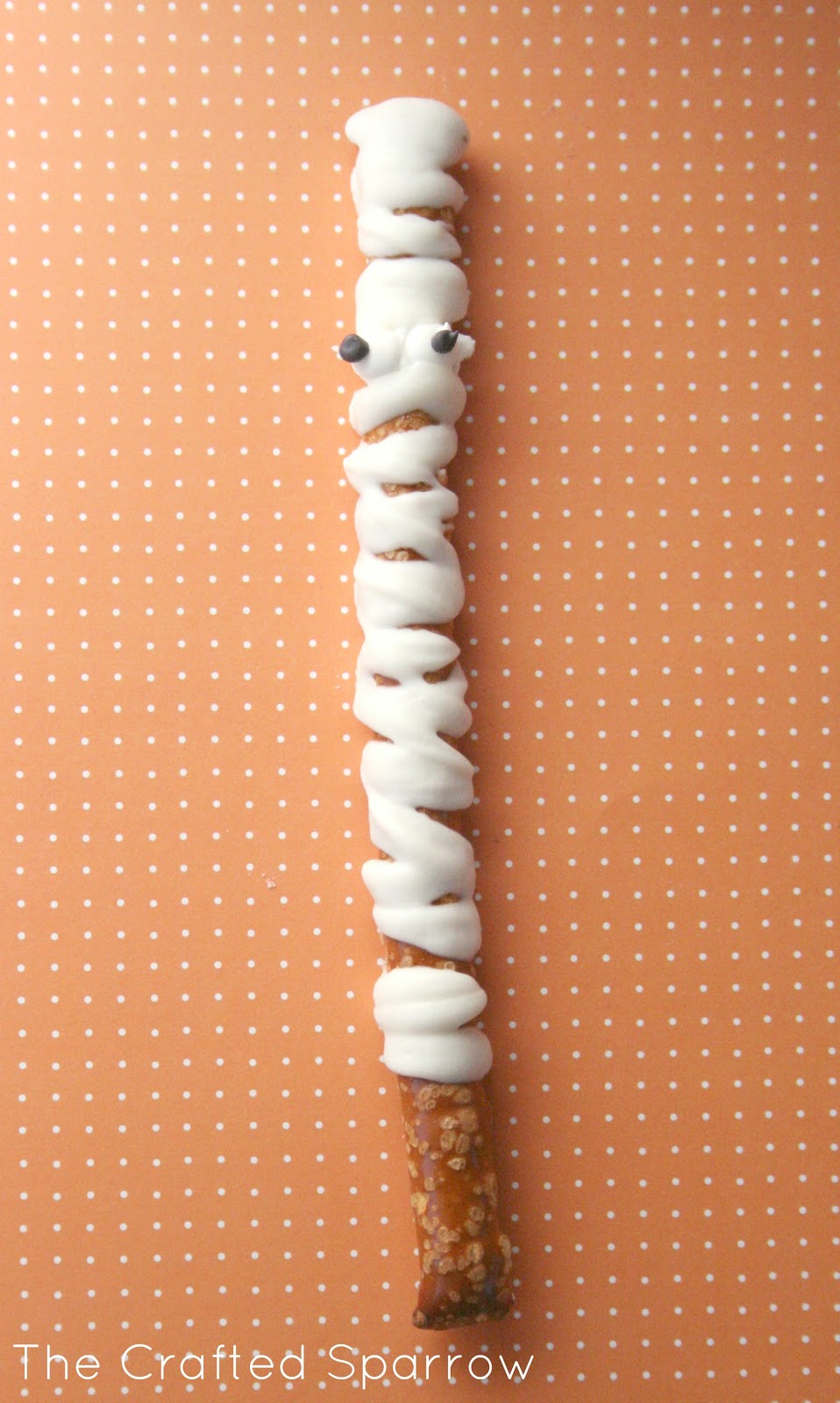 Now on to the Mummy Pretzels. Melt your vanilla bark according to the back of the package, again start with half the package if your doing smaller quantities. You can always use the rest of the package if you need it. Begin by placing two royal icing eyes on the rod towards the top, use your left over white royal icing and a toothpick to adhere them to the rod. When your bark is ready use a small spoon to gently spoon the vanilla bark back and forth over the pretzel rod. Careful to not cover the awesome eyes you made. Place carefully on your sheet of wax paper to dry. It usually seems that the vanilla bark takes longer to harden than the chocolate so I’d give it a good two hours to harden. If you have broken pieces of pretzels left over break them in to 1″ pieces and dip them in any remaining bark coating and keep them for yourself!