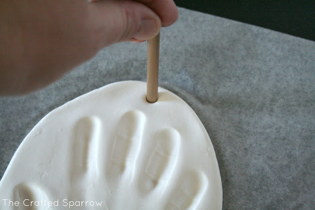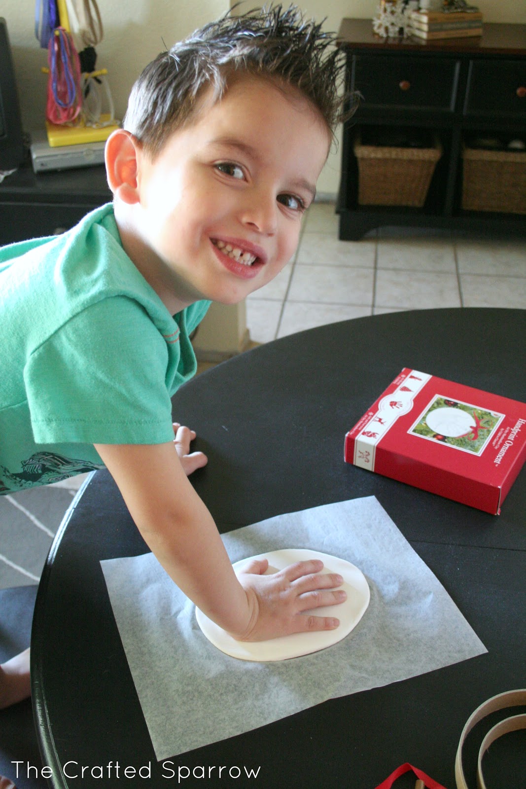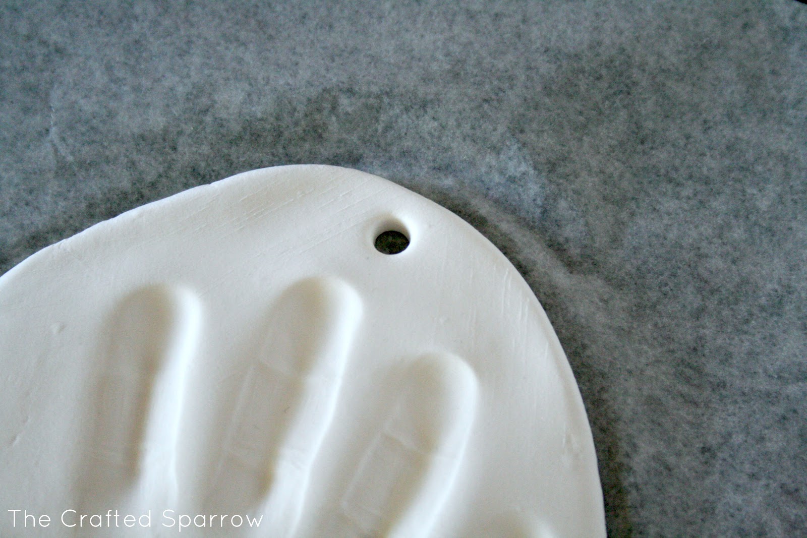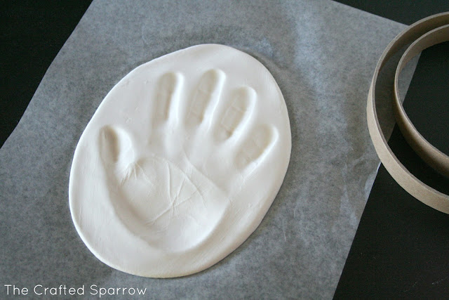 This was seriously super easy. You open the clay pouch and then knead your clay for a minute or two to get any air bubbles out. Then on a piece of wax paper just roll it out. I ended up rolling mine in to a sort of oval shape instead of trying for the round cookie cutter look. The only reason I did this is because Corbyn’s hand print was too large for the sizes of cookie cutters provided. I created a hole using the tool provided for the ribbon. I then just made the imprint of his hand and let it dry per the instructions. Once it was dry I added the ribbon.