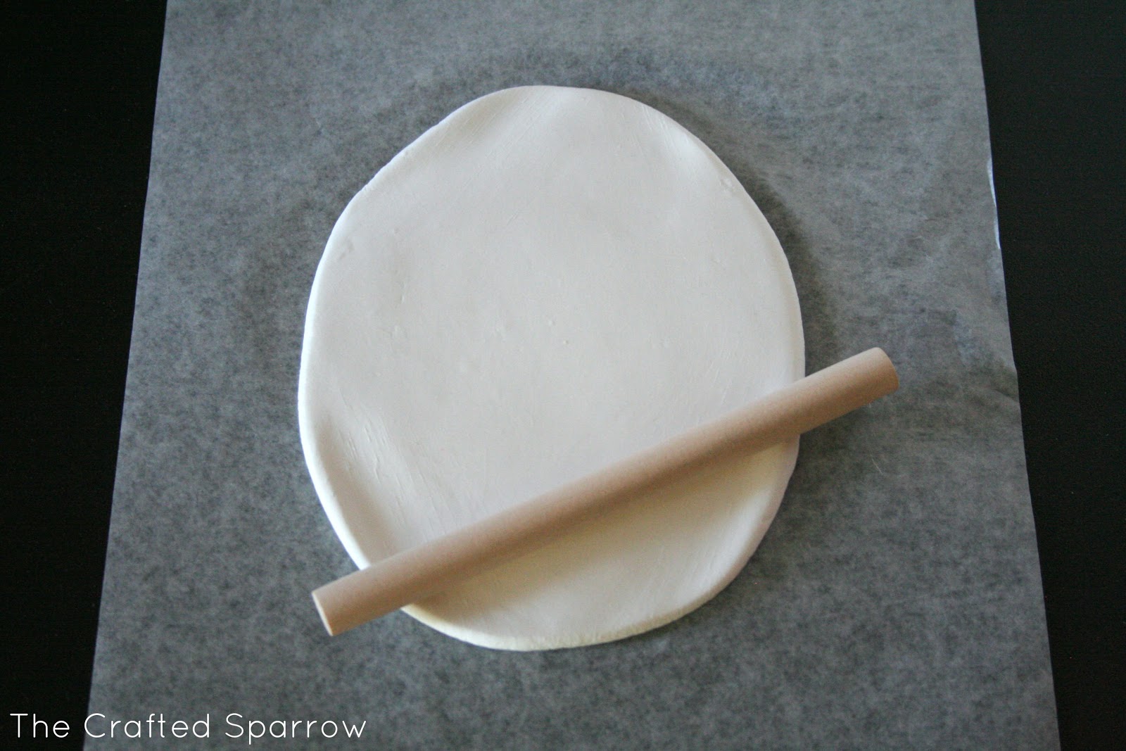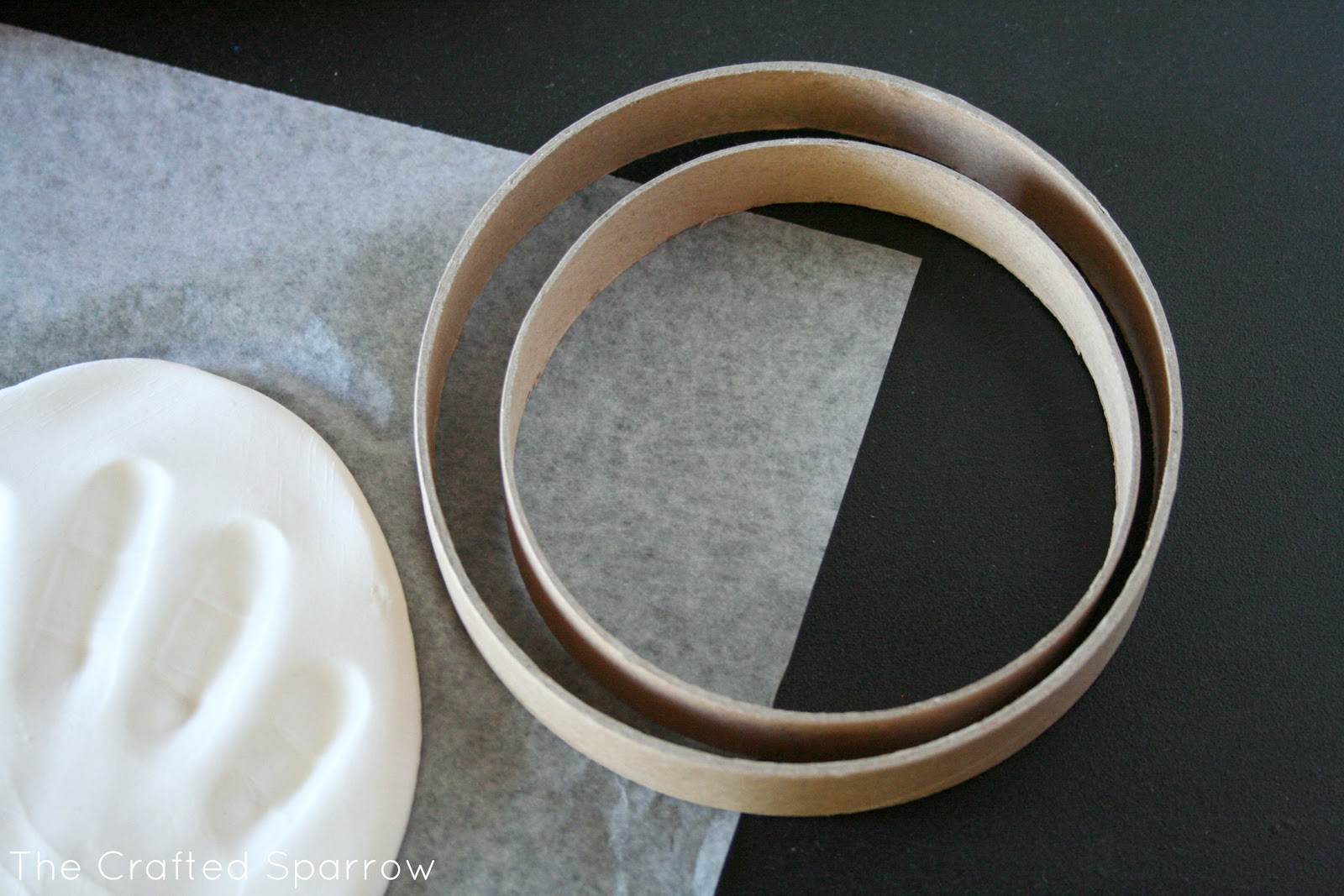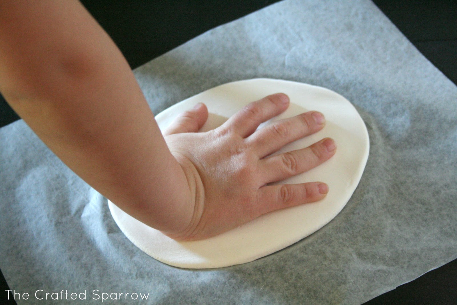 This was seriously super easy. You open the clay pouch and then knead your clay for a minute or two to get any air bubbles out. Then on a piece of wax paper just roll it out. I ended up rolling mine in to a sort of oval shape instead of trying for the round cookie cutter look. The only reason I did this is because Corbyn’s hand print was too large for the sizes of cookie cutters provided. I created a hole using the tool provided for the ribbon. I then just made the imprint of his hand and let it dry per the instructions. Once it was dry I added the ribbon.
