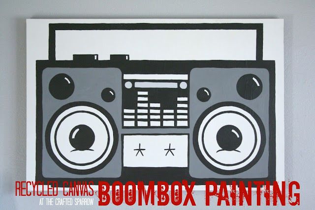 Yesterday I shared the new Carriage Bolt Headboard that we made for our oldest son’s room makeover. Today I’m sharing the Recycled Canvas Boombox Painting that I created to hang over his bed. I knew we wanted some large over the bed and luckily I had purchased a canvas print from Ross several months prior to this project that I had never used. Honestly I don’t even know why I bought the canvas print, I liked the colors and that was about it. It was on clearance for $11 though, and even if I didn’t ever use it…that price for a canvas that size was worth it. Here’s what it looked like before: