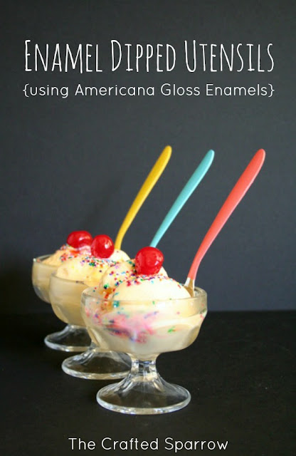 While shopping at Cost Plus World Market recently I saw THESE awesome enamel utensils. As much as I loved them at $12 for a set of 4 utensils that was out of my price range at the moment. So I decided to grab some Americana Gloss Enamels paint and make my own Enamel Dipped Utensils.
