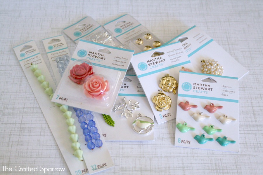 The new Martha Stewart Crafts Jewelry line includes 240 items for both avid jewelry crafters and beginners. These are the things I was sent to create with. The entire line consists of charms, cabachons, Czech glass beads, findings, enamel paints, jewelry glazes, epoxy clay for creating cabachons, and rhinestones. Can you take one guess what my favorite item is? Yep, those totally adorable little bird charms. I knew when I saw them in the store I wanted them. So I was thrilled to see them in the package.