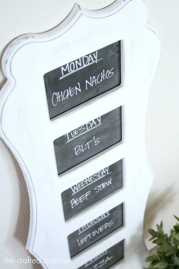 Once everything was dry I sanded all the edges around my frame and some spots on the front of the frame. I wanted the gray to peak through with the wood. Then I just popped the small board inserts back in the frame and used a chalkboard marker to label my days. Since there is only 6 spots, Saturday & Sunday are a combined day. For us that totally works since we usually eat out on Saturdays or just snack.
