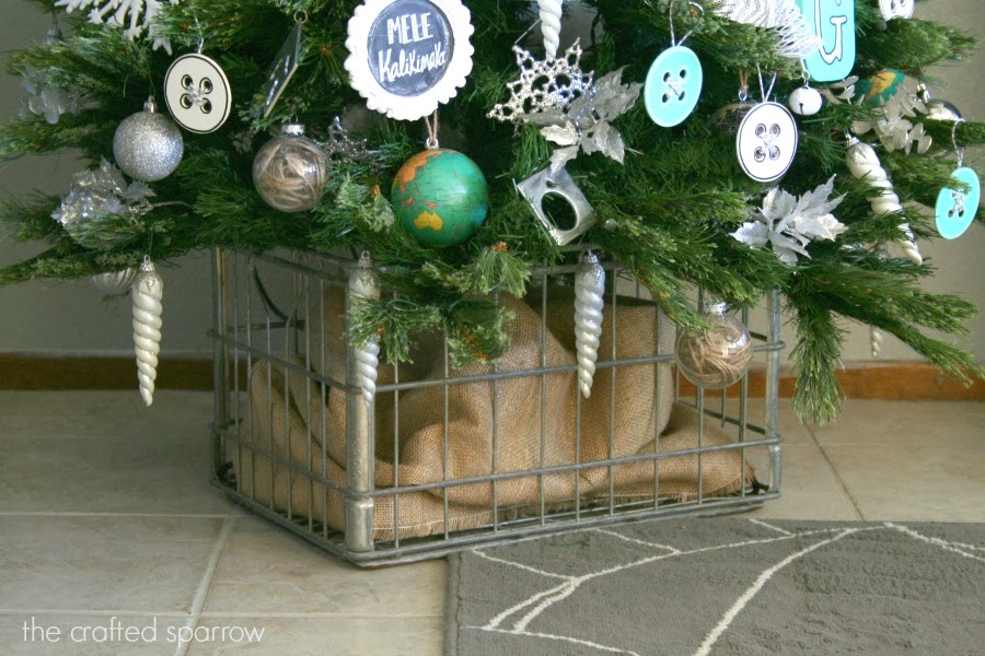 I snagged this vintage metal crate from my mom’s house a few months ago, and it was the perfect solution to not having a tree skirt this year. I love how it worked out, I just added some draped burlap inside the crate to cover my tree stand. Surprisingly not having a tree skirt under the tree this year has kept our troublesome cat out of it! Who knew.