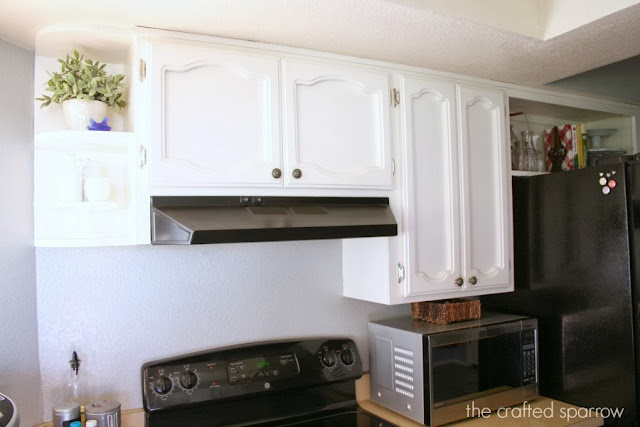 On each side of the cabinets by the bay window are these little display shelves. One thing I do not love is the new ceiling crack that runs from the cabinets all the way to the center of the raised portion of the ceiling. I’m praying it’s not a sign of bad things to come with the cabinets over the counter.