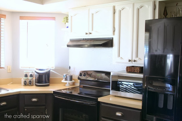 Our kitchen is small, not tiny…but not the most well thought out plan the builders could have come up with. The ceilings are dropped to about 9 ft. which makes this space so much smaller. We have the 1980’s cabinets over our large section of the countertop. Unfortunately it’s something at this present time we can’t take down either. If we did we would literally have no space for dishes to eat off of. As you can see we have two very narrow cabinets next to the fridge, two small cabinets above the fridge and the stove. Eventually my goal would be to remove these over the counter cabinets to open the space up and build a custom cabinet for dishes somewhere.