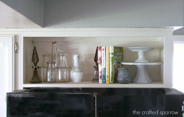 I removed the doors above the fridge, we couldn’t even open them before anyway since the fridge is so tall. When we bought the fridge we had to cut about 2″ off the bottom trim of the cupboard to get it to fit in there. I love having this open space and eventually it will be filled with fabulous things. For now it has some of the vintage milk bottles I found at a garage sale a few years ago, and some other small decor.